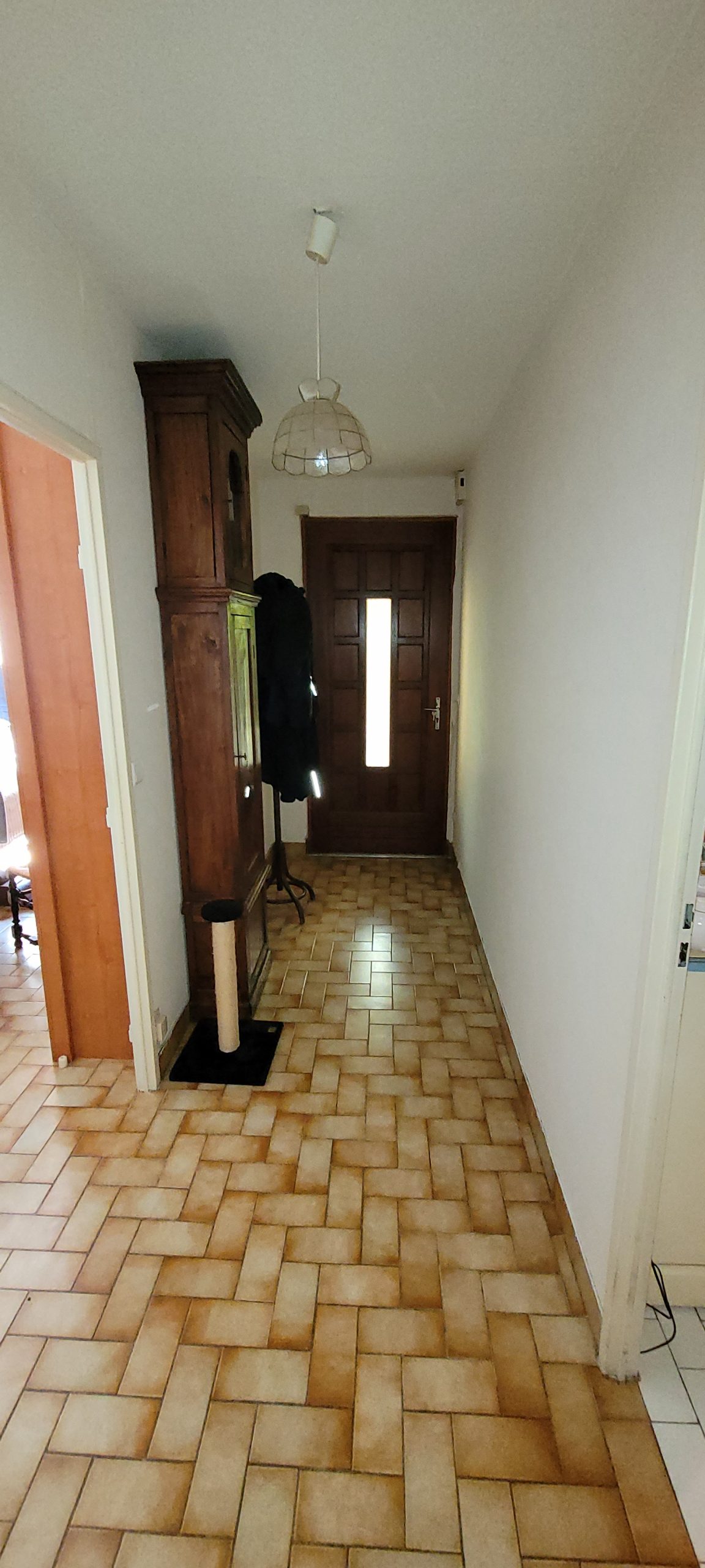 La cloison donnant sur le couloir des chambres et salle de bains a été coupée en deux afin de mettre en place un claustra .