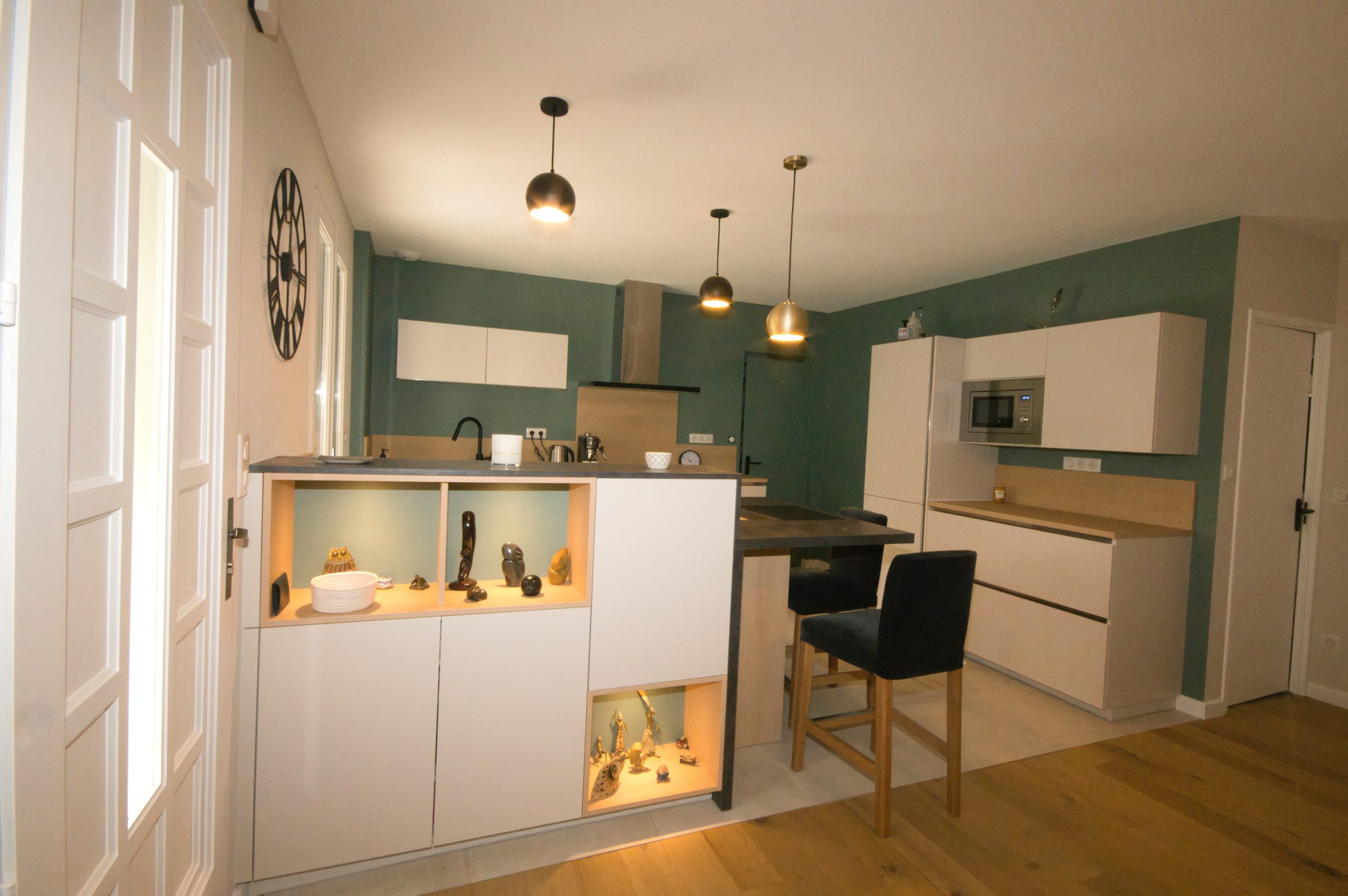 Séparation cuisine et salle à manger , des petites étagères , éclairage LED d’ambiance et un petit bar associé au plan de travail permettant de prendre petit déjeuner et café